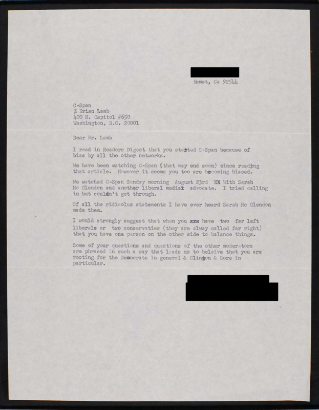 Accuses C-SPAN of liberal bias, especially after featuring Sarah McLendon, suggests a more balanced journalistic program.