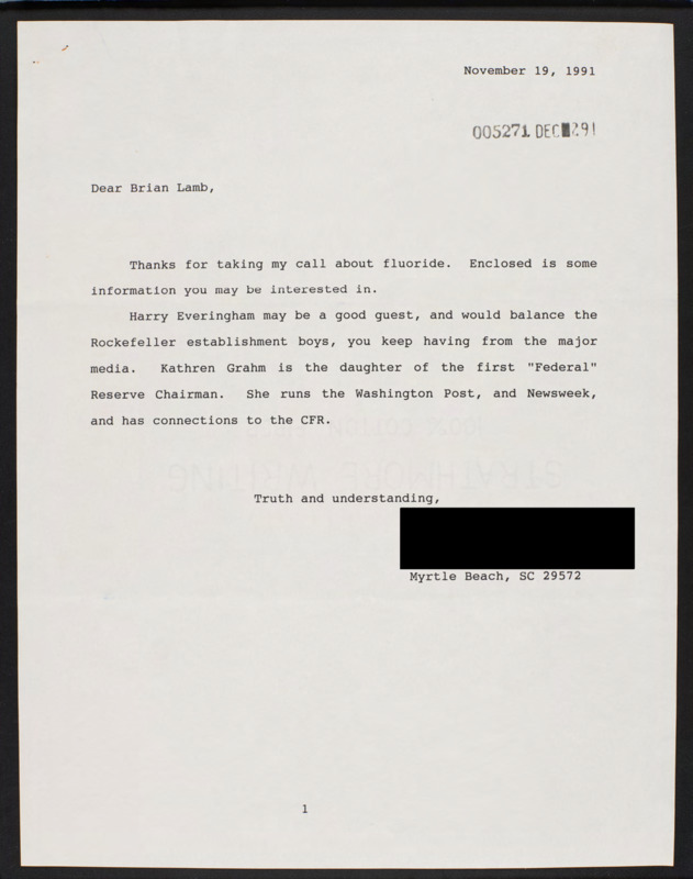 Suggests guests for C-SPAN to invite to speak. Attached is information about flouride and two brochures.