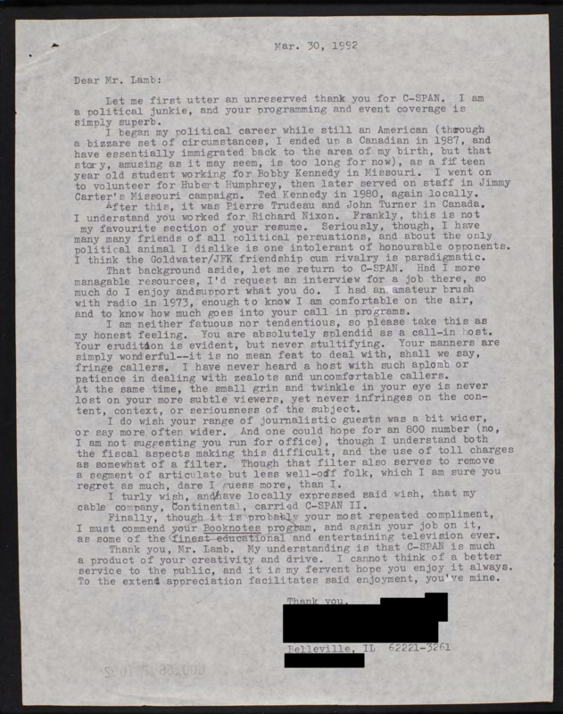 Shares personal work history in the United States and Canada, praises C-SPAN, and wishes the range of journalists would be widened.