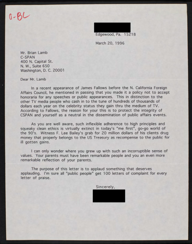 Letter to C-SPAN, 1996-03-20; 15218