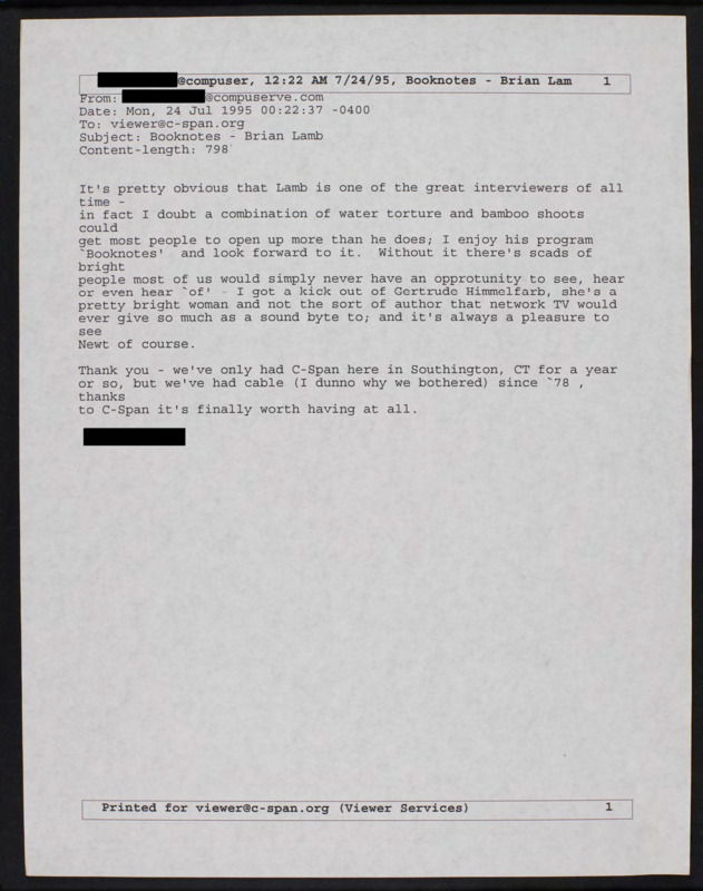 Letter to C-SPAN, 1995-07-24