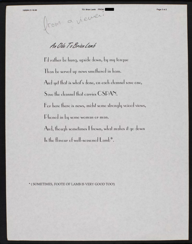 - Letter to C-SPAN, 1994-10-09