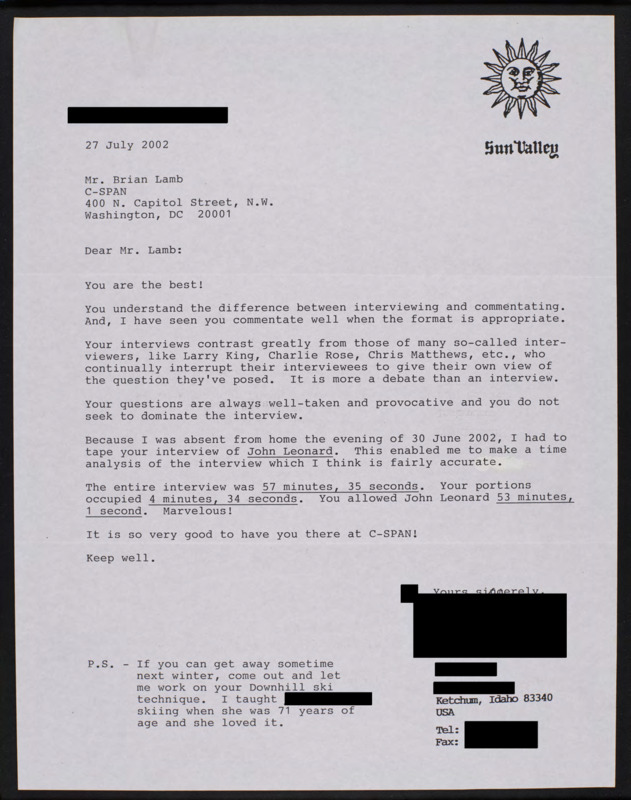 Praises Brian Lamb as an interviewer by comparing Lamb to other interviewers, then invites Lamb skiing; includes correspondence between himself and Pamela Harriman praising his ski instruction.