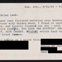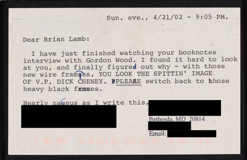 States opinion that Brian Lamb looks like Dick Cheney with his glasses on and suggests he change them.