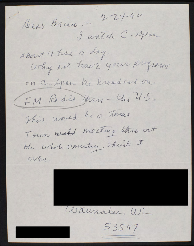 Letter to C-SPAN, 1992-02-24; 53597