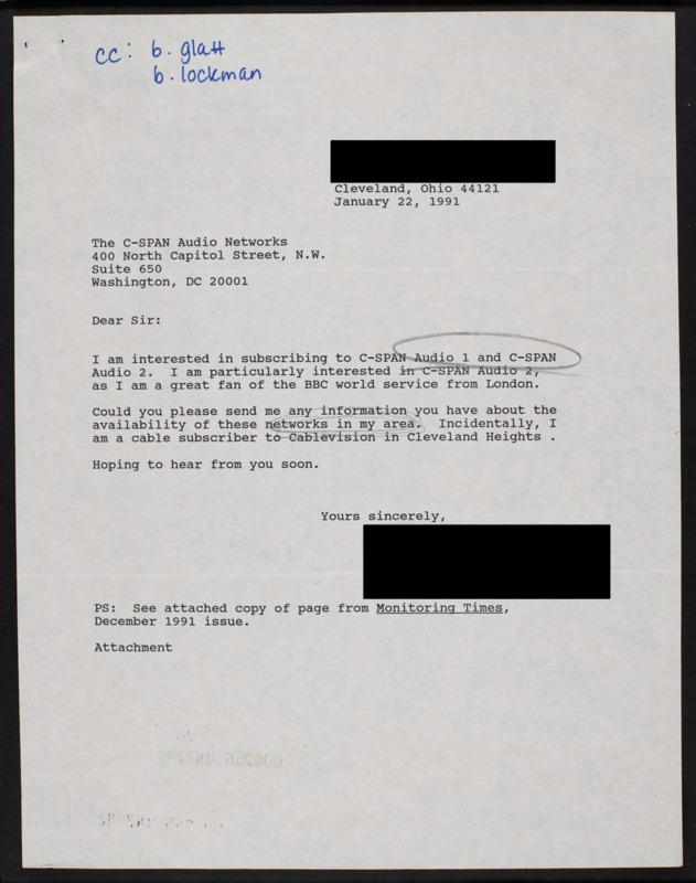 Requests information about obtaining C-SPAN Audio 1 &2.