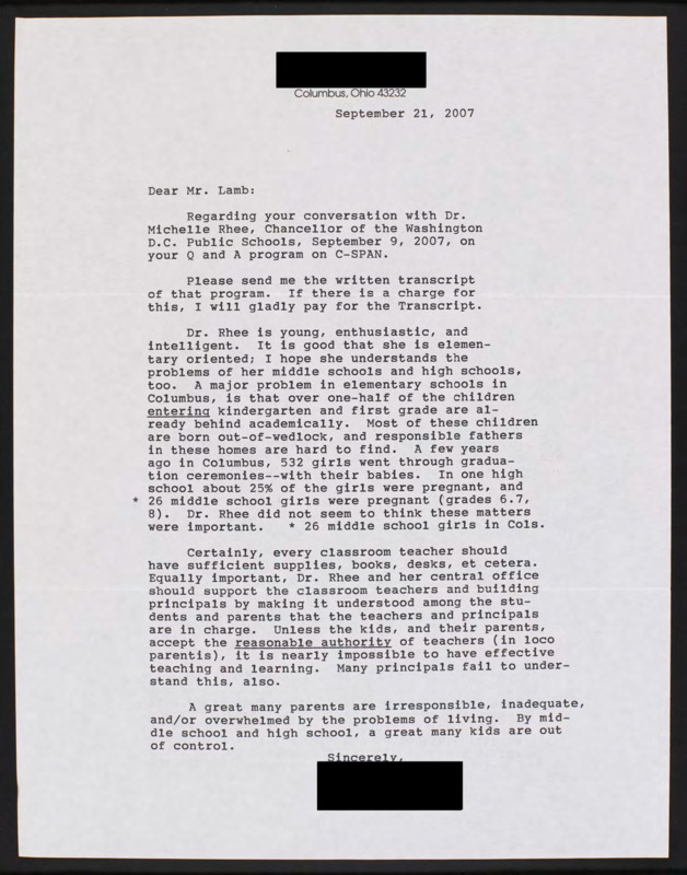 Asks for a transcript of a program featuring the chancellor of the D.C. public schools.