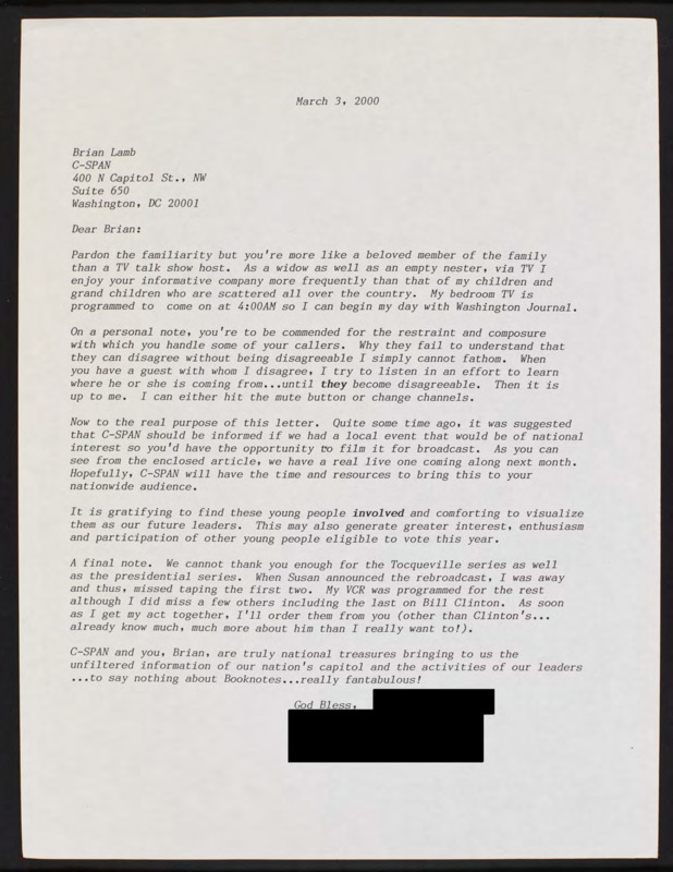 Letter to C-SPAN, 2000-03-03