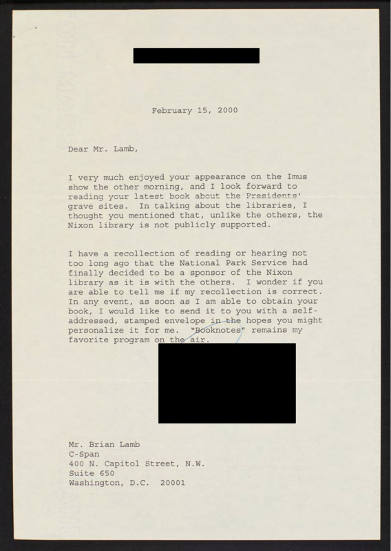 States enjoyment of a program on the U.S. Presidents and offers information about the Nixon Presidential Library.