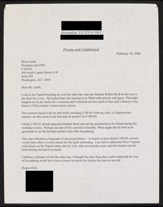 Suggests C-SPAN do a series following Senator Robert Byrd.