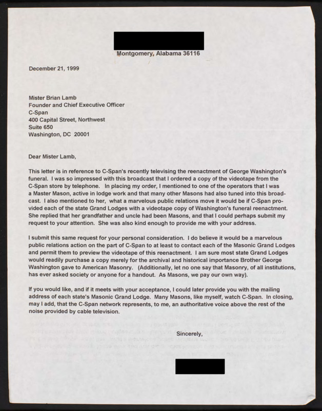 Requests that C-SPAN cover some of the Masonic Grand Lodges' reenactments of George Washington's funeral.