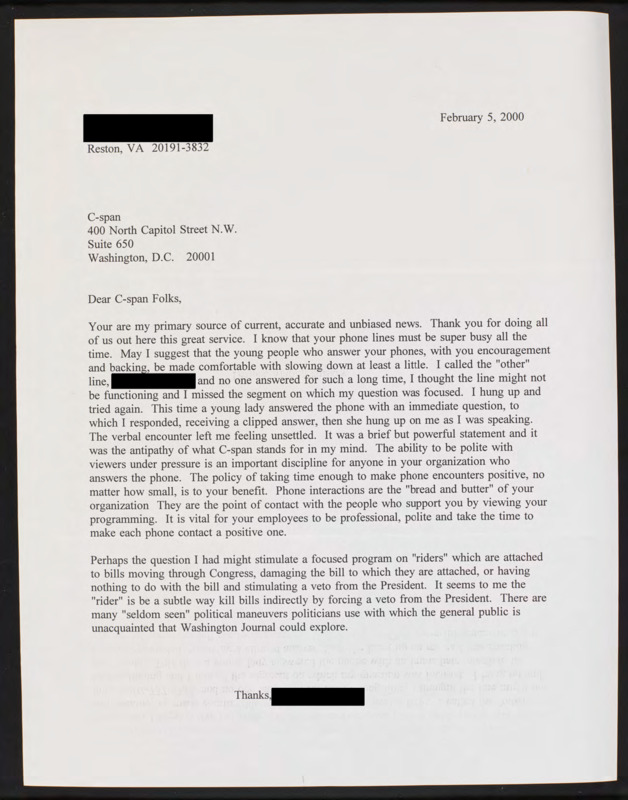 Suggests C-SPAN take more time in answering phone calls from viewers and asks a question about bills.
