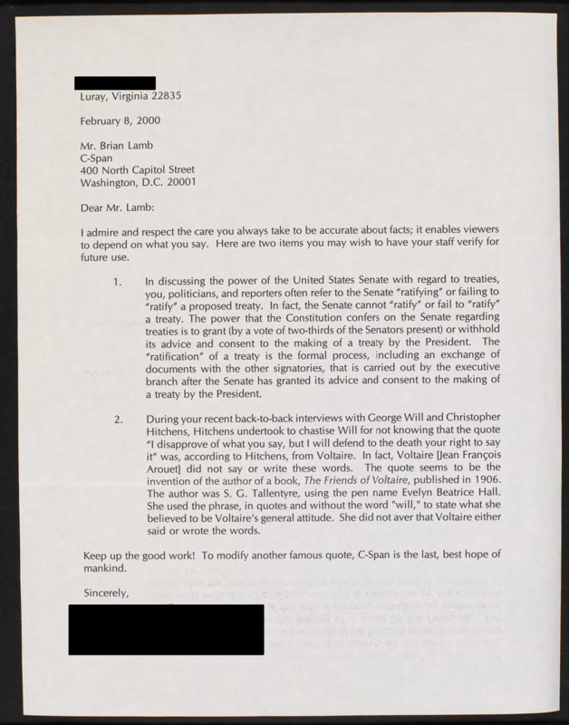 Requests that C-SPAN staff verify two items regarding Senate proceedings and a misattributed quotation.