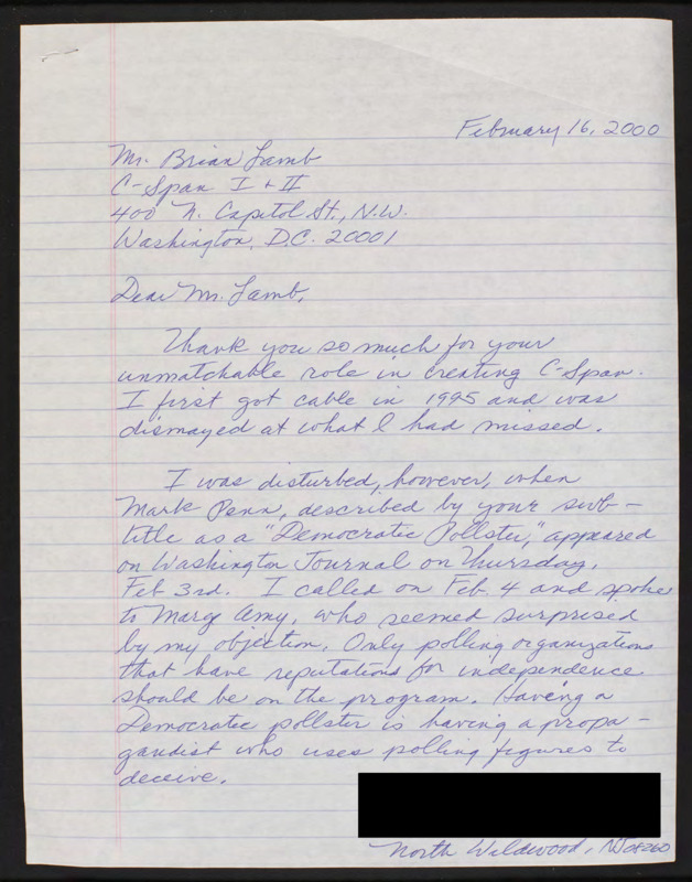 Criticizes C-SPAN for having a "Democratic Pollster" on their program.