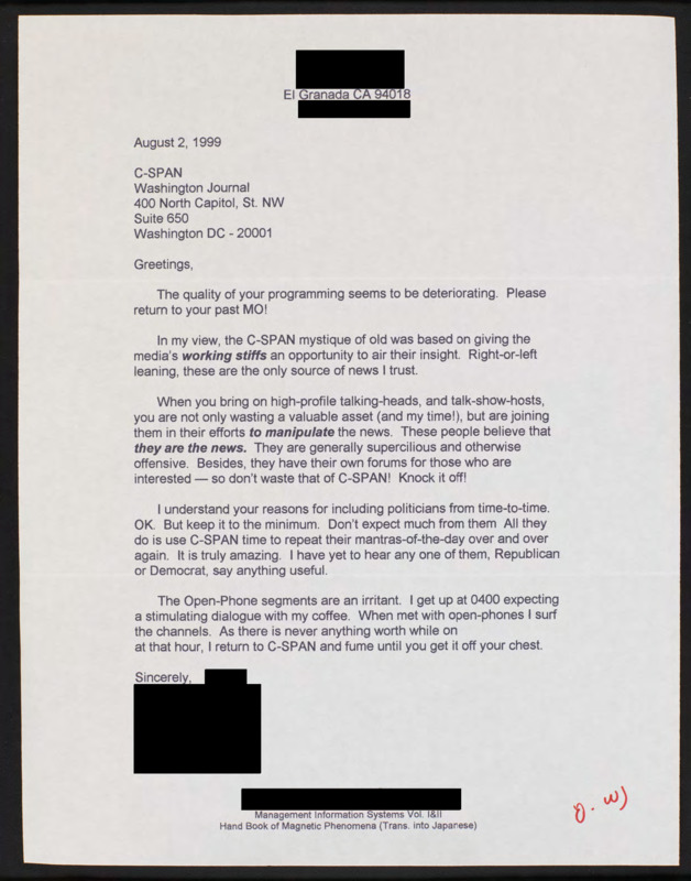 Letter to C-SPAN, 1999-08-02; 94018