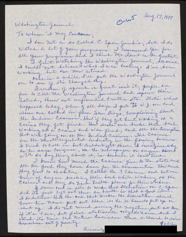 Letter to C-SPAN, 1999-08-17