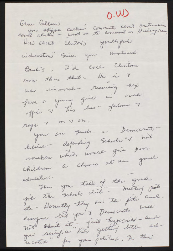 Accuses C-SPAN of bias toward Bill Clinton and disparages liberal views about education and gun control.