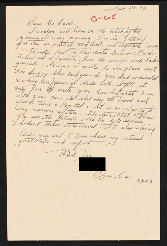 Compliments many C-SPAN programs, then complains about the background for the Washington Journal program.