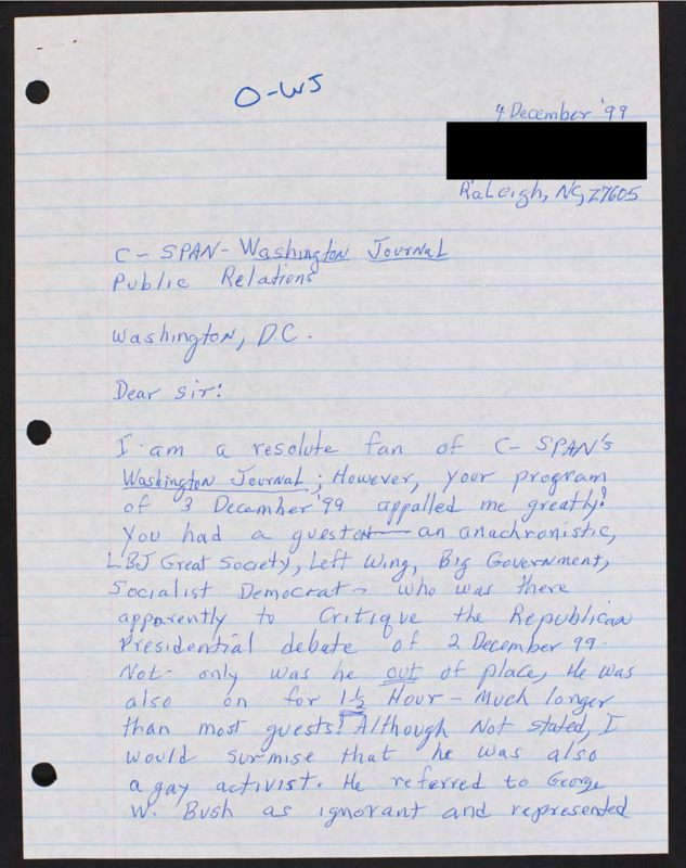 Letter to C-SPAN, 1999-12-04; 27605