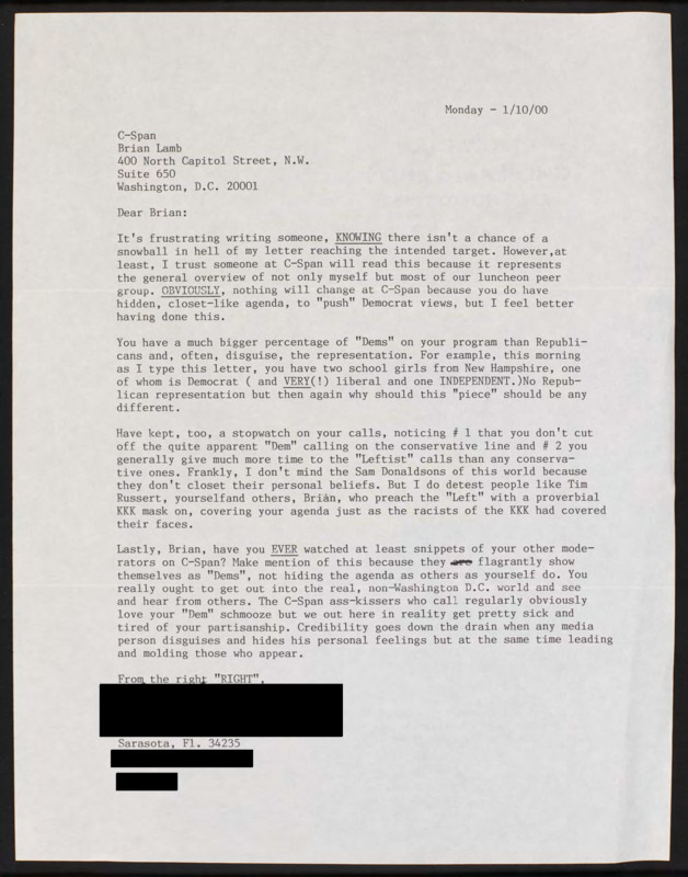 Expresses anger that C-SPAN is supposedly pushing Democrat views.