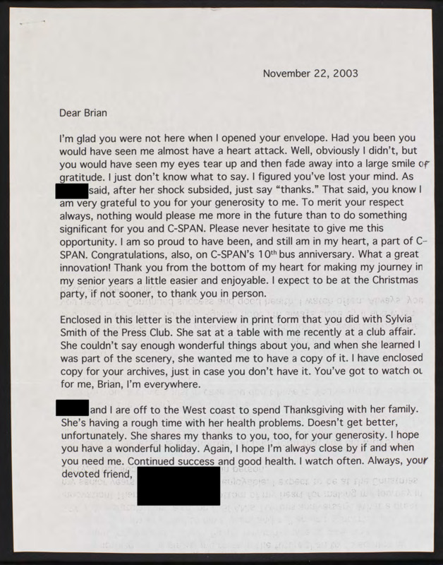 Thanks Brian Lamb for generosity and congratulates him on the C-SPAN Bus's 10th anniversary.