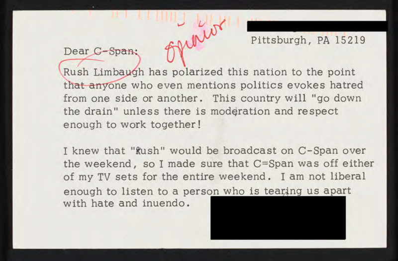 Criticizes Rush Limbaugh for further polarizing America, expresses discontent that C-SPAN is broadcasting his show.
