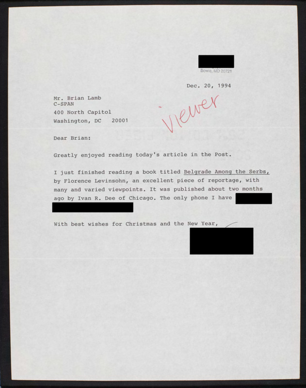 Letter to C-SPAN, 1994-12-20; 20721