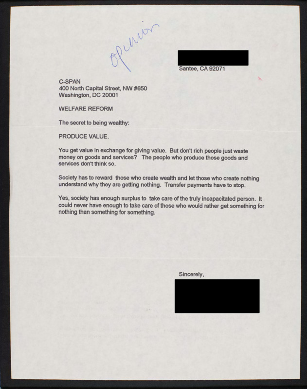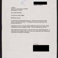 Criticizes welfare recipients because they don't create wealth and, therefore, don't deserve free money.