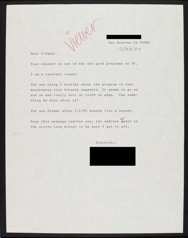 Letter to C-SPAN, 1994-12-23; 94960