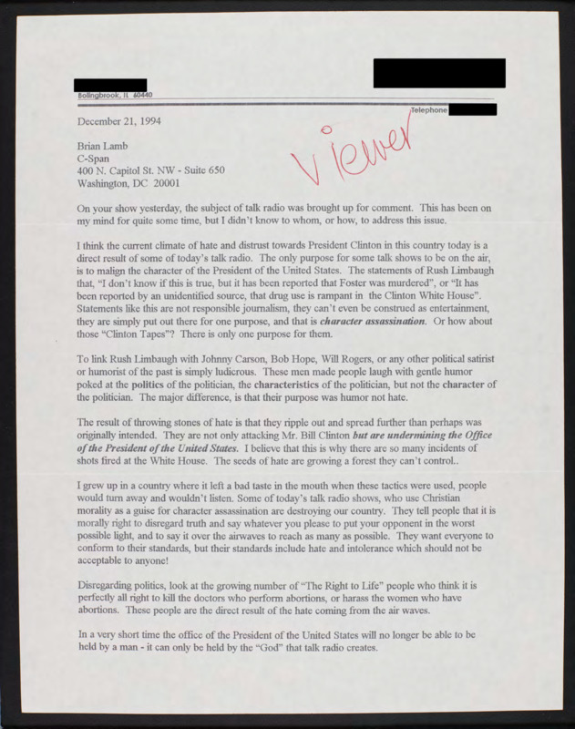 Analyzes talk radio's role in the dissemination and proliferation of Clinton hatred, particularly cites Rush Limbaugh as dangerous.