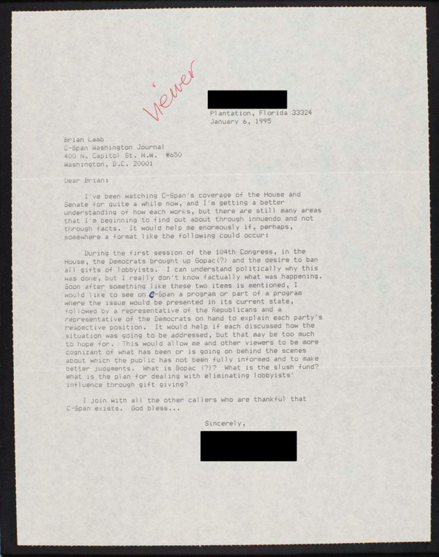 Letter to C-SPAN, 1995-01-06; 33324