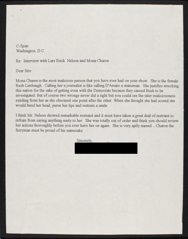 Expresses discontent with interview with Mona Charen, calls her the female Rush Limbaugh, but appreciation for her counterpart, Lars Erick Nelson.