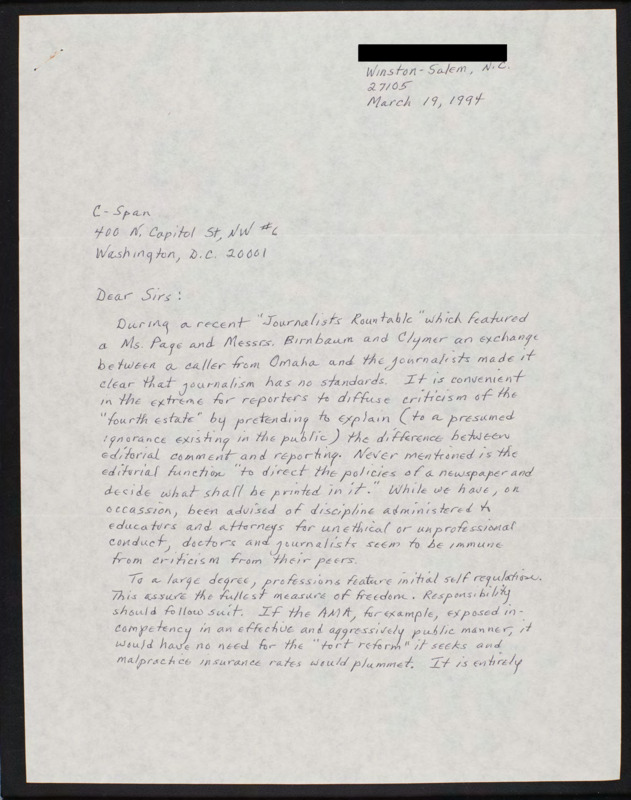 Discusses ethics and professionalism, and the standards of journalism, as regarding journalists on C-SPAN, and the faith that we place in journalists.