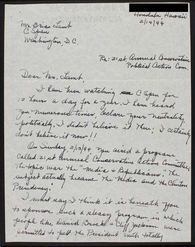 Letter to C-SPAN, 1994-02-14