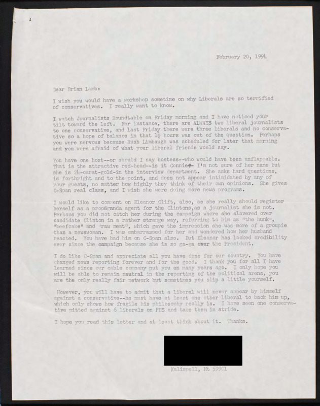 Discusses why she feels liberals are afraid of conservatives, Eleanor Clift, and majority of liberals on C-SPAN.