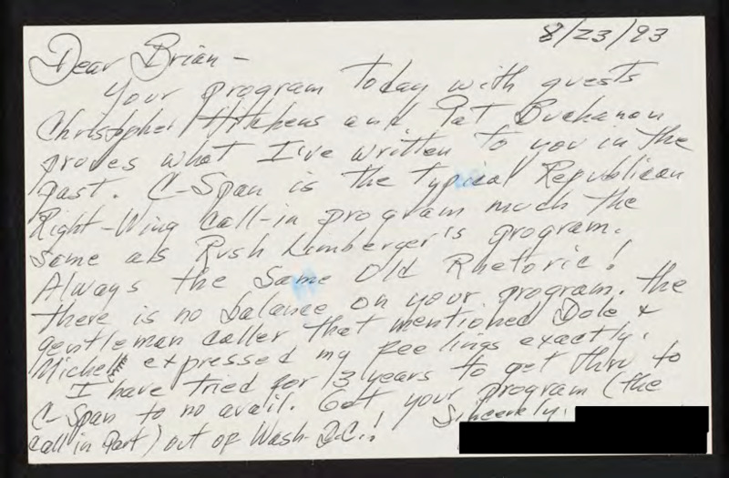 Accuses C-SPAN of peddling Republican propaganda after watching show with Pat Buchanan and Christopher Hitchens.