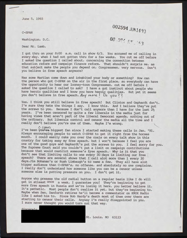 Letter to C-SPAN, 1993-06-05; 63123