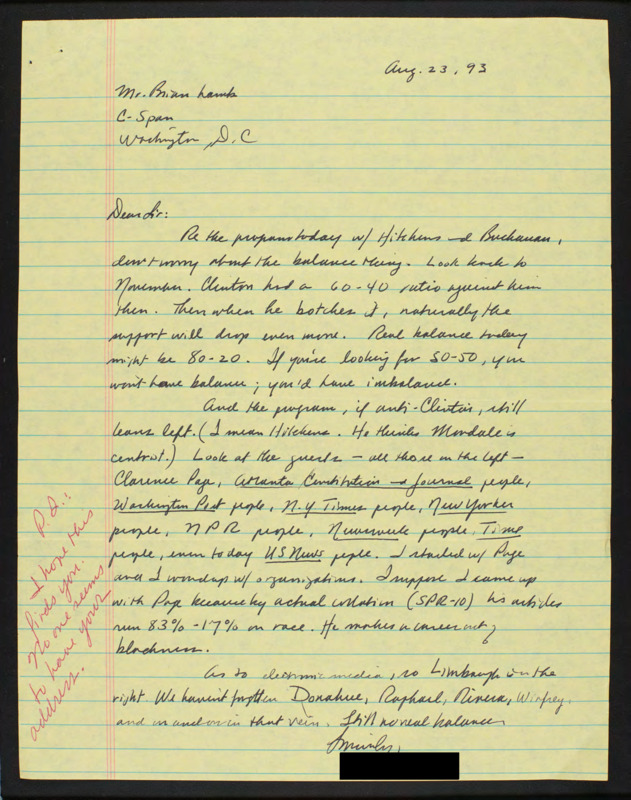 Says that balance isn't an issue (regarding Hitchens and Buchanan) because C-SPAN is biased to the left due to the newspapers represented on program.