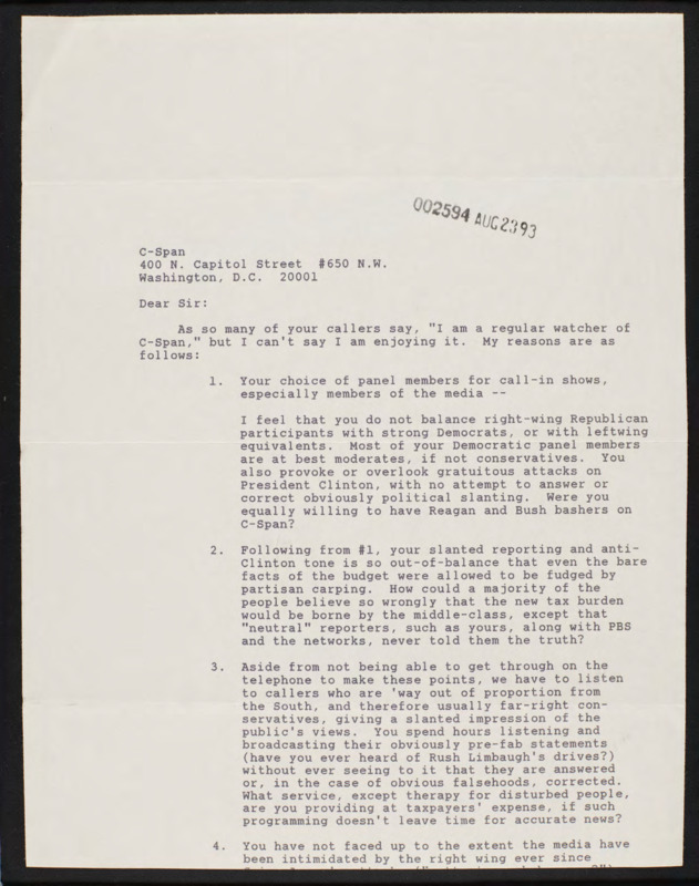 Criticizes C-SPAN for its conservative bias, apparent on call-in shows and anti-Clinton comments, suggests more equal balance.