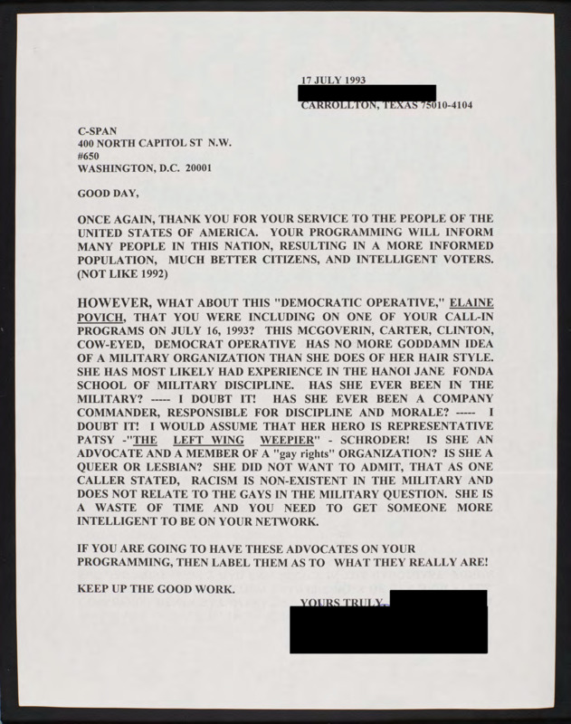 Expresses discontent with guest Elaine Povich who, apparently, didn't know what she was talking about regarding the military (and racism and homosexuality in the military).