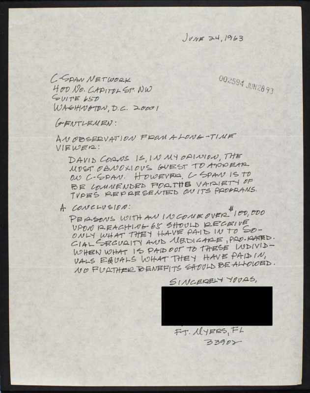 Letter to C-SPAN, 1993-06-24; 33902
