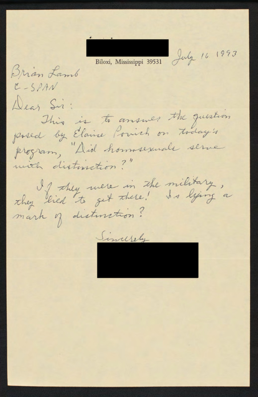 Addresses point made by Elaine Povich about homosexuals in the military, says they lied to get in.