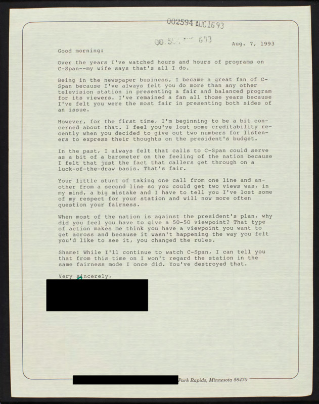 Letter to C-SPAN, 1993-08-07; 56470