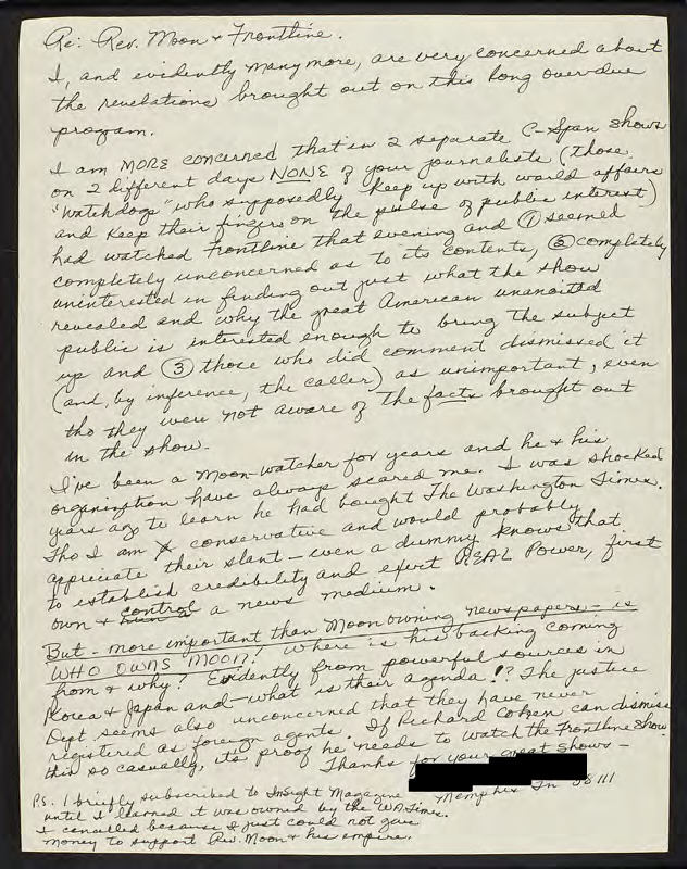 Discusses issues with C-SPAN's journalists intentionally ignoring information and dismissing it, then expresses concerns about Sun Myung Moon and continues to discuss the power dynamics concerning news organizations and disseminating information.
