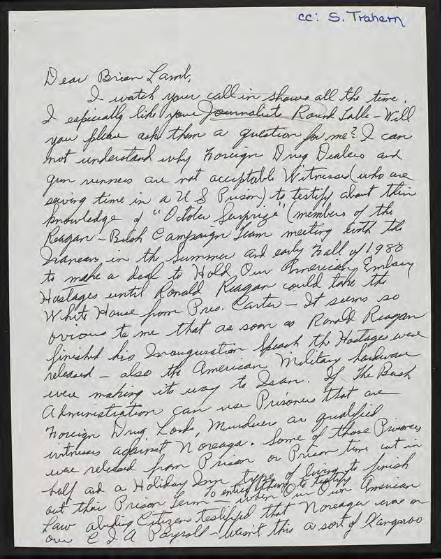 Inquires why the drug dealers that were imprisoned by Reagan and later released are unable to testify about "October Surprise."