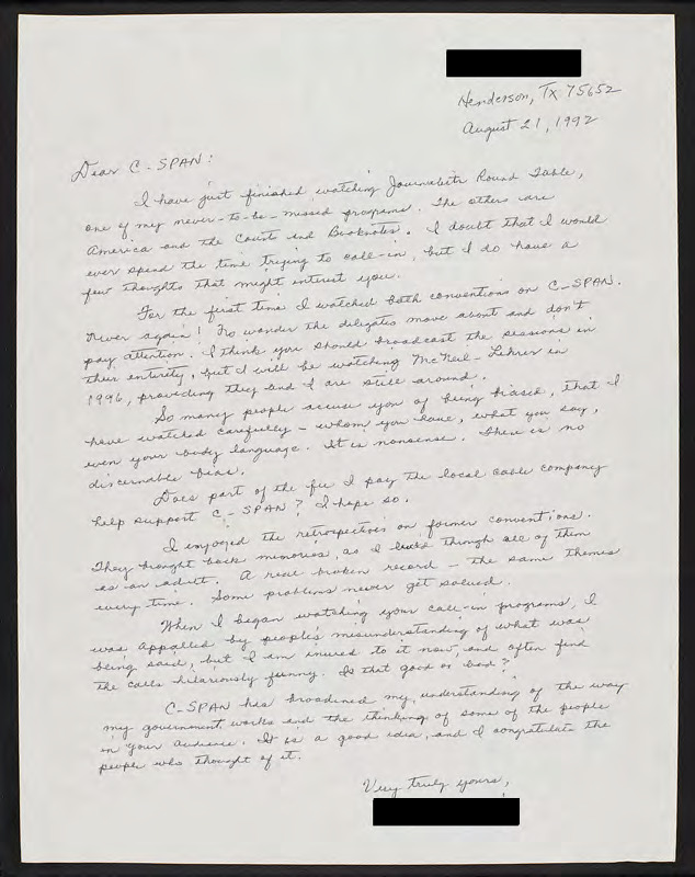Letter to C-SPAN, 1992-08-21; 75652
