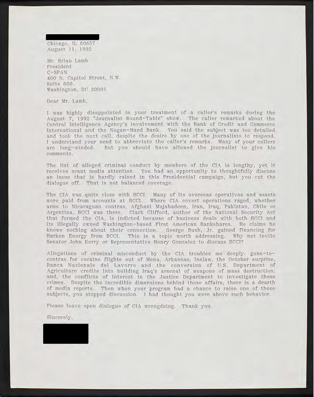 Letter to C-SPAN, 1992-08-11; 60657