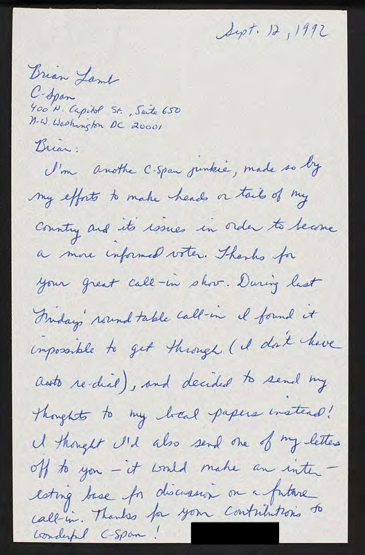 Letter to C-SPAN, 1992-09-12