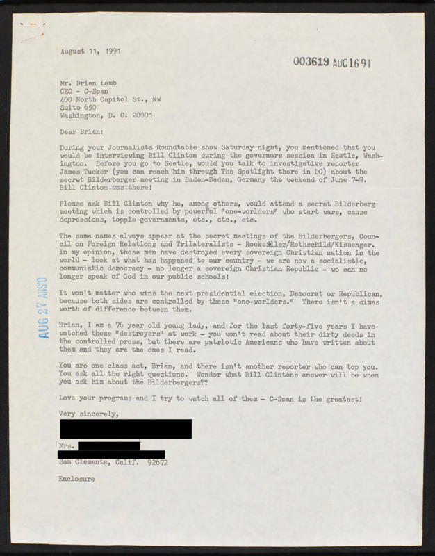 Asks Brian Lamb if he will ask Bill Clinton about a secret meeting with Bilderbergers.