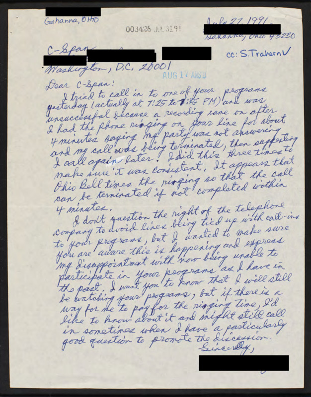 Letter to C-SPAN, 1991-07-27; 43230